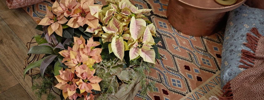 Lempeät pinkin ja kerman sävyt tuovat kotiin ripauksen itämaista luksusta. Yhdistettynä kultaisiin yksityiskohtiin ja murretun syviin sävyihin ne tuovat lämpöä ja satumaista tunnelmaa pimeisiin kuukausiin. Joulutähdet kukkivat runsaasti, joten niistä voi huoletta napsia myös kestäviä leikkoja vaikkapa piristämään kuivakukka-asetelmaa. Tällöin varren leikkuukohta kannattaa ensin dipata kiehuvaan veteen, ja kastaa sen jälkeen heti kylmään. Näin maitiaisnesteen eritys tyrehtyy.
